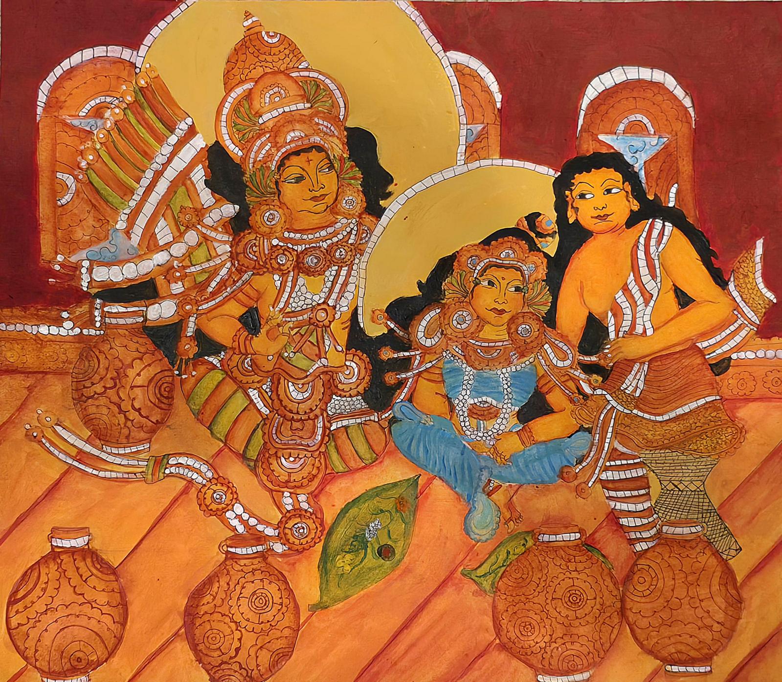 This painting depicts the miracle at the wedding in Cana, where Jesus turns water into wine. Here, He is talking to His mother, Mary, and a servant. He is telling the servant to fill more pots with water. The pots are all around Jesus. This is because He will always give us what we need. Additionally, both Mary and Jesus are sitting on the floor and eating off banana leaves with their hands because that is how people eat at traditional Indian weddings. The servant is listening to Jesus’s instructions while sitting on a moda, which is a traditional Indian, woven stool that is still popular in many Indian households. By painting it so that everyone follows Indian traditions, I am helping South Indian people see themselves in and feel closer to Christ. This is important because God became human so that we may feel closer to Him.